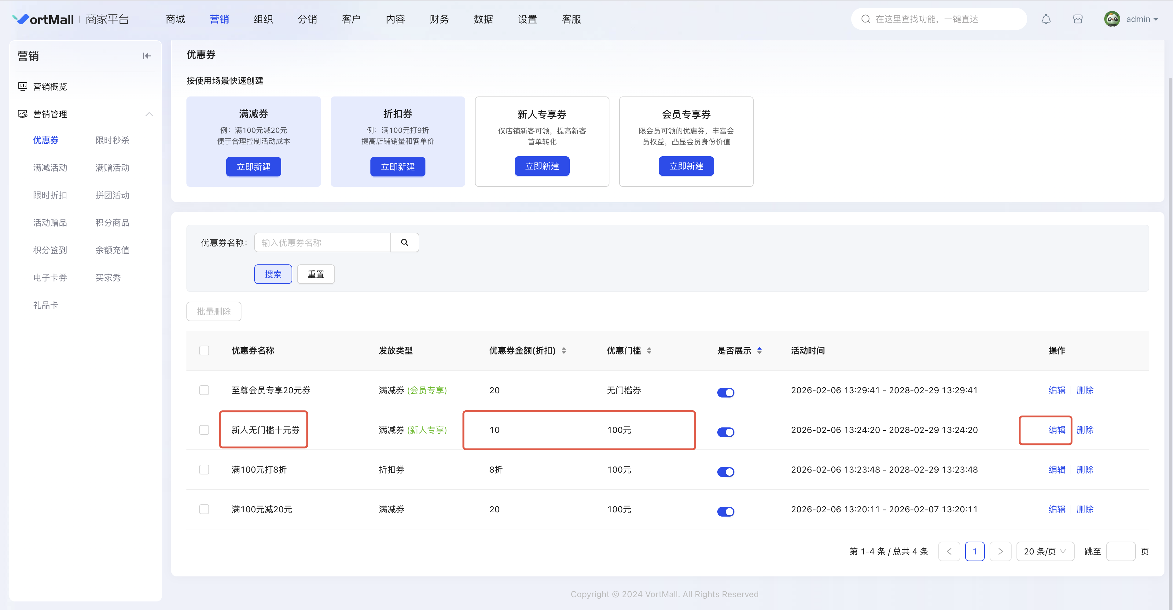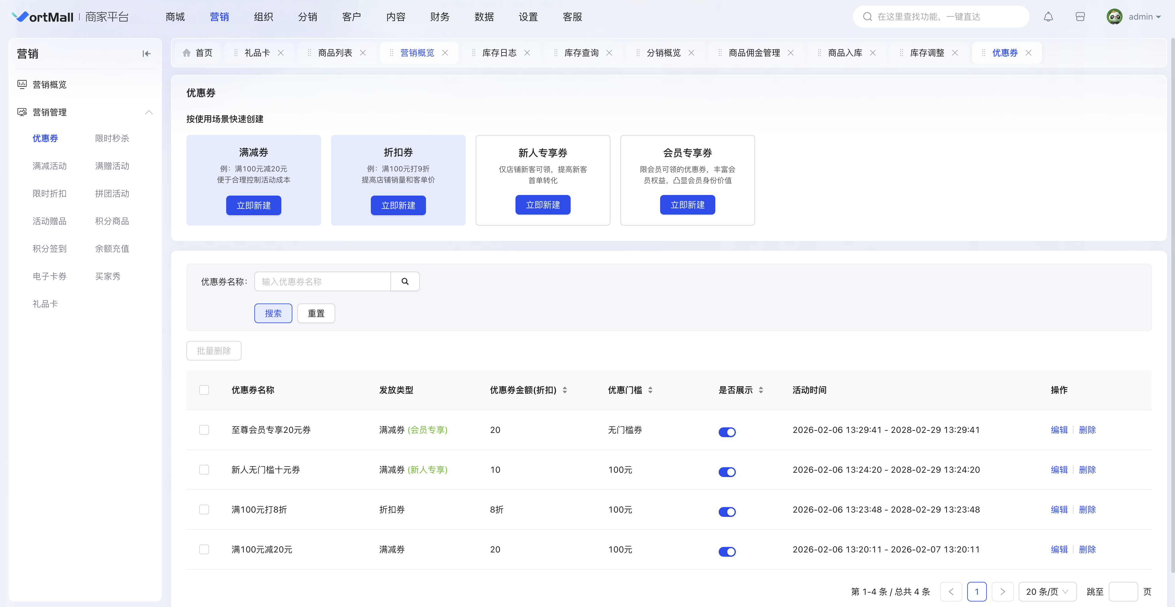 (可操作展示/停用/编辑/删除优惠券)