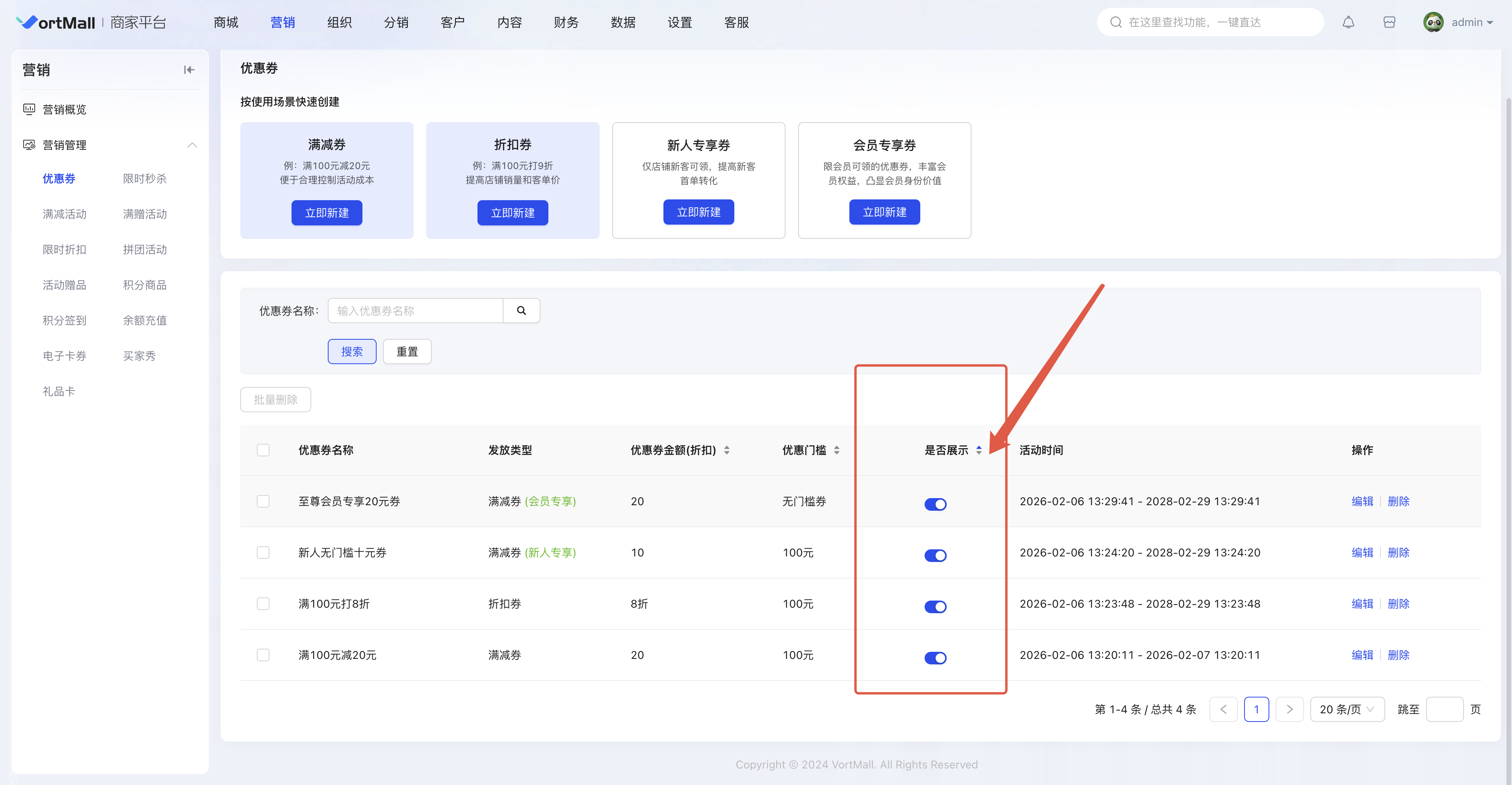 优惠券是电商平台和零售商城最常用的营销工具之一,其核心目的是通过价格、用户行为引导和精准营销,提升整体运营效率,实现用户增长、订单转化和用户复购、提升用户体验的目的。本文档旨在指导管理员如何通过Vortmall商城系统后台管理优惠券功能,以实现提高商城订单量的目的。
