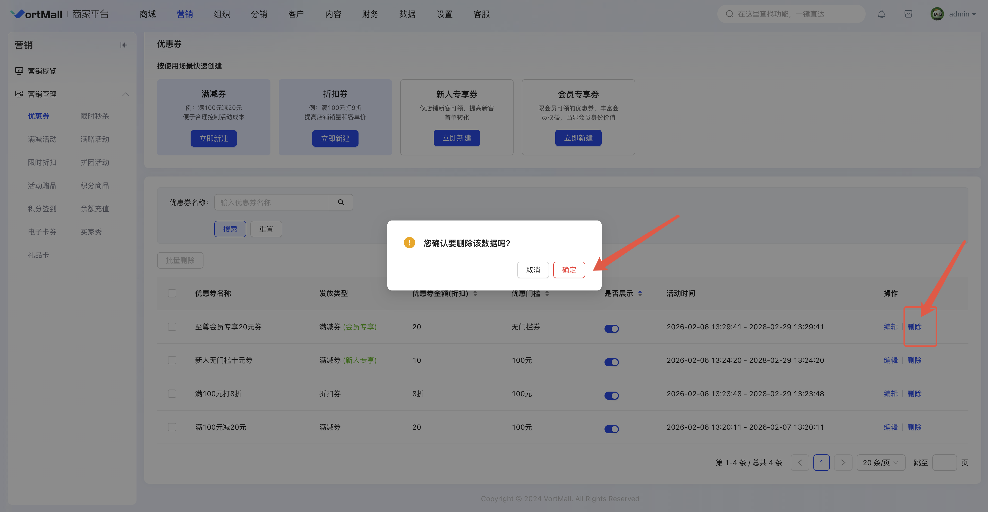- 删除优惠券:过期、未启用优惠券支持一键删除,便于商家在优惠券列表中管理已启用的优惠券,保持后台的整洁性。