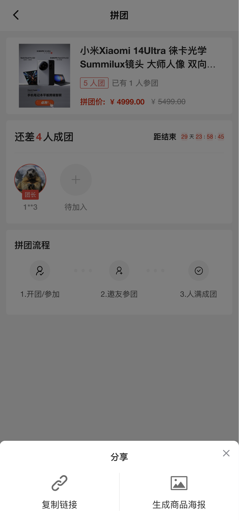 下单成功后,系统自动生成拼团凭证(移动端支持复制链接 / 生成二维码图片,PC 端直接生成分享链接)。消费者可将邀请链接/海报分享至社区群、好友私聊等社交场景,邀请同社区 / 周边好友参与拼团。